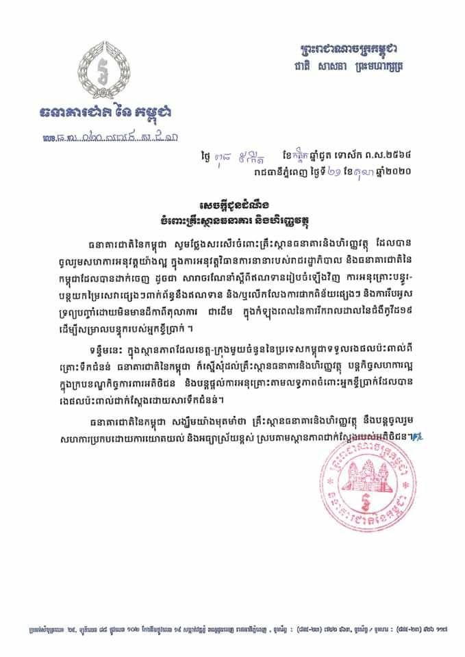 ភ្លាមៗក្រោយពីសម្តេចអំពាវានាវដូច្នេះ នៅក្នុងថ្ងៃតែមួយនោះ ធនាគារជាតិកម្ពុជា បានជូនដំណឹងដល់គ្រឹះស្ថានហិរញ្ញវត្ថុទំាងអស់ថា« បន្តកិច្ចសហប្រតិបត្តិការល្អ ក្នុងប្រខណ្ឌកិច្ចការពារអតិថជន និងបន្តផ្តល់ការអនុគ្រោះតាមលទ្ធភាពចំបោះអ្នកខ្ចីប្រាក់ដែលបានរងផលប៉ះពាល់ជាក់ស្តែងដោយាសារទឹកជំនន់» ។