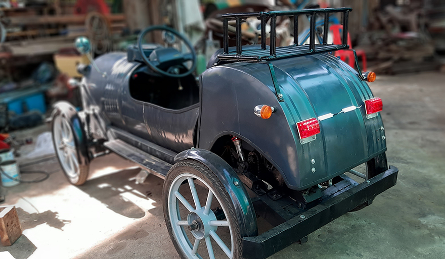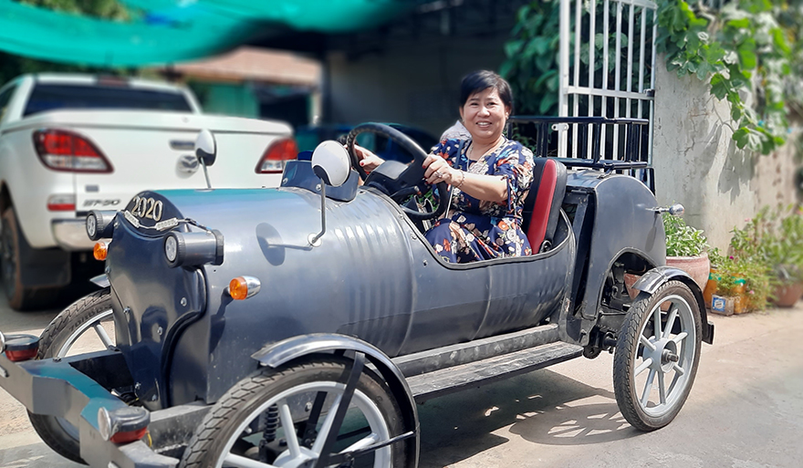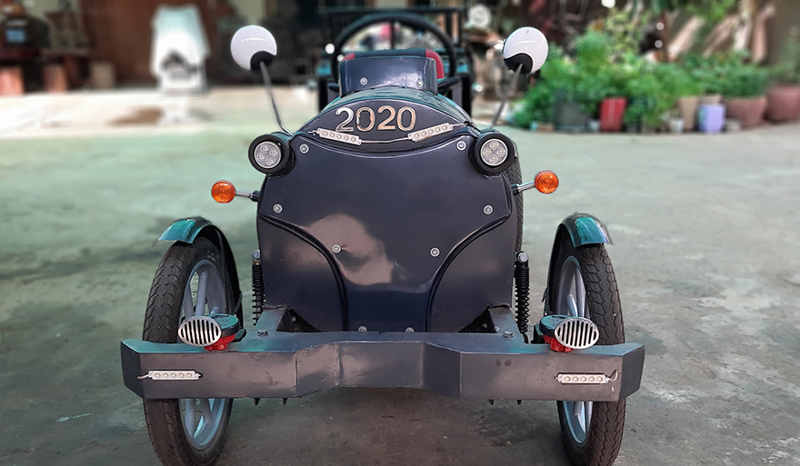 បើតាមលោក ខៀវ ណាវី វ័យ៦៥ឆ្នាំ មានប្រសាសន៍ឲ្យដឹងនៅរសៀលថ្ងៃទី៧ មិថុនា២០២០ថា រថយន្តកែច្នៃធុនតូច១គ្រឿង ត្រូវបានផ្សំឡើងពីធុងសាំង ម៉ាស៊ីនម៉ូតូ C100 កូរ៉េ ដោយត្រូវបានដំឡើងក្នុងចុងឆ្នាំ២០១៩ និងរួចរាល់ក្នុងឆ្នាំ២០២០ ហើយចំណាយទឹកប្រាក់អស់ជាង១.០០០ដុល្លារ គឺបានបង្កើតឡើងដោយស្នាដៃរបស់គាត់តែម្នាក់គត់ សម្រាប់ជិះនៅក្នុងក្រុងកំពង់ចាម និងទៅចំការនៅឯទន្លេបិទ ស្ថិតក្នុងស្រុកត្បូងឃ្មុំ ខេត្តត្បូងឃ្មុំ។