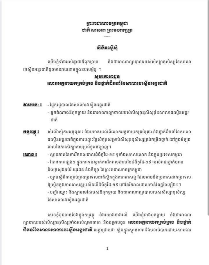 ការស្នើសុំនេះដោយតំណាងអាណាព្យាបាលសិស្សប្រមាណ៣០នាក់ បានជួបប្រមូលផ្តុំ យកលិខិតស្នើទៅជួបលោកអគ្គនាយកសាសានៅសាខាកណ្តាល ដែលស្ថិតនៅភូមិ ទំនប់ ក្នុងសង្កាត់ភ្នំពេញថ្មី ខណ្ឌសែនសុខ រាជធានីភ្នំពេញ កាលពីវេលាម៉ោងប្រមាណ២ និង៣០នាទី រសៀល ថ្ងៃទី០៨ ខែមិថុនា ឆ្នាំ២០២០នេះ។