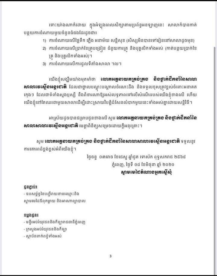 ដោយហេតុថា ចំនួនម៉ោងរៀន ក៏បានកាត់បន្ថយ(សិស្សនៅកម្រិតមត្តេយ្យរៀនបានត្រឹមកន្លះពេលតែប៉ុណ្ណោះ ចំណែកសិស្សធំៗ ក៏រៀនមិនបានគ្រប់ម៉ោងដូចកាលរៀននៅសាលាដែរ)។ ២.ថ្លៃរដ្ឋបាល សុំផ្អាកបង់សម្រាប់ ឆ្នាំសិក្សាថ្មី២០២០-២០២១ រហូតដល់ស្ថានភាពជំងឺកូវីដ-១៩ អាចគ្រប់គ្រងបានហើយ រដ្ឋាភិបាលប្រកាសឲ្យបើកថ្នាក់សិក្សាដូចធម្មតាវិញ។ និង៣.សម្រាប់តម្លៃសិក្សា២០២០ ២០២១ សុំបញ្ចុះតម្លៃ៥០ភាគរយដោយមិនកំណត់ចំនួនសិស្សរហូតដល់ពាក់កណ្តាលខែសីហា ឆ្នាំ២០២០។