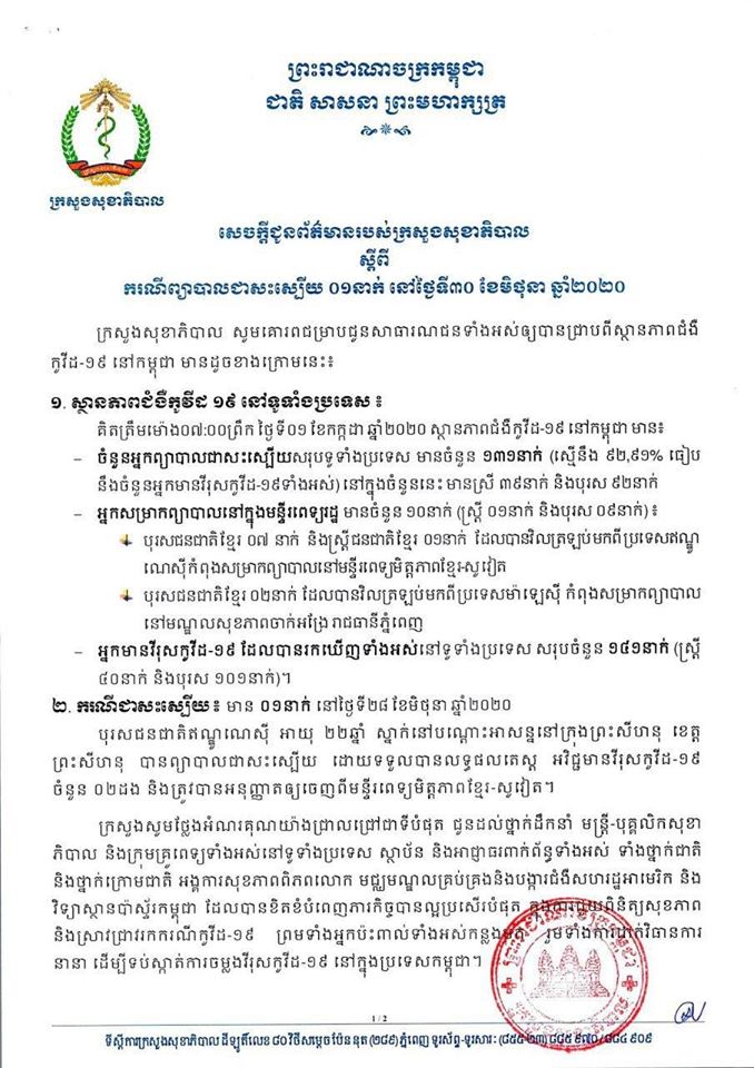 ក្រសួងសុខាភិបាលបានឲ្យដឹងនៅថ្ងៃទី១ ខែកក្កដា ឆ្នាំ២០២០ បានឲ្យដឹងថា បានព្យាបាលអ្នកឆ្លងជំងឺកូវីដ១៩ ចំនួន១នាក់ ដែលរហូតមកដល់ពេលនេះអ្នកព្យាបាលជាសះស្បើយសរុបទូទាំងប្រទេសមានចំនួន១៣១នាក់ ស្មើនឹង៩២.៩១.% ធៀបនឹងចំនួនអ្នកមានវីរុសកូវីដ១៩ទាំងអស់ ។