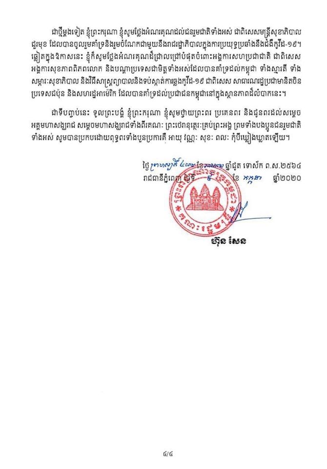 ជាថ្មីម្ដងទៀតសម្ដេចតេជោ ហ៊ុន សែន ថ្លែងអំណរគុណដល់ជនរួមជាតិទាំងអស់ ជាពិសេសមន្ត្រីសុខាភិបាលជួរមុខដែលបានចូលរួមគាំទ្រ និងរួមចំណែកជាមួយនឹងរាជរដ្ឋាភិបាលក្នុងការប្រយុទ្ធប្រឆាំងនឹងជំងឺកូវីដ-១៩ ។