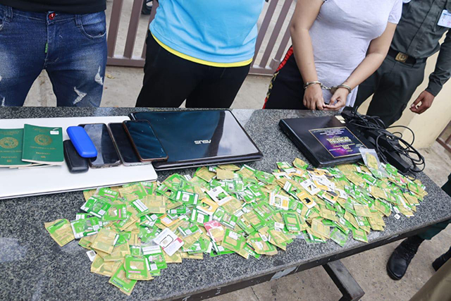 ចំណែកវត្ថុតាងដែលនគរបាលដកហូតបានរួមមាន កុំព្យួទ័រចំនួន៣គ្រឿង, ម៉ូតូចំនួន៣គ្រឿង, លិខិតឆ្លងដែនចំនួន៤ក្បាល និងស៊ីមកាតគ្រប់ប្រពន្ធ័មួយចំនួនធំ។