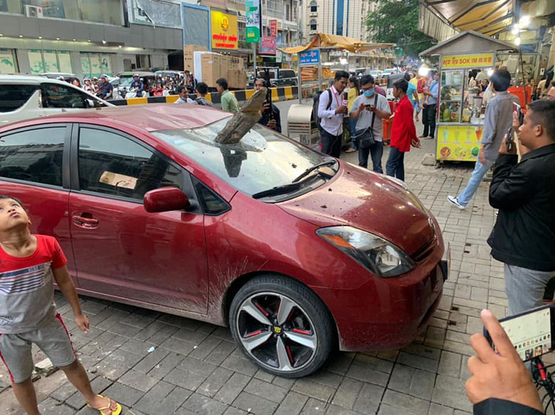 ធ្លាក់បំណែកស៊ីម៉ង់ត៍ លើអាគារចាស់ទ្រុធទ្រោម ចំរថយន្តចត់ទុកខាងក្រោម