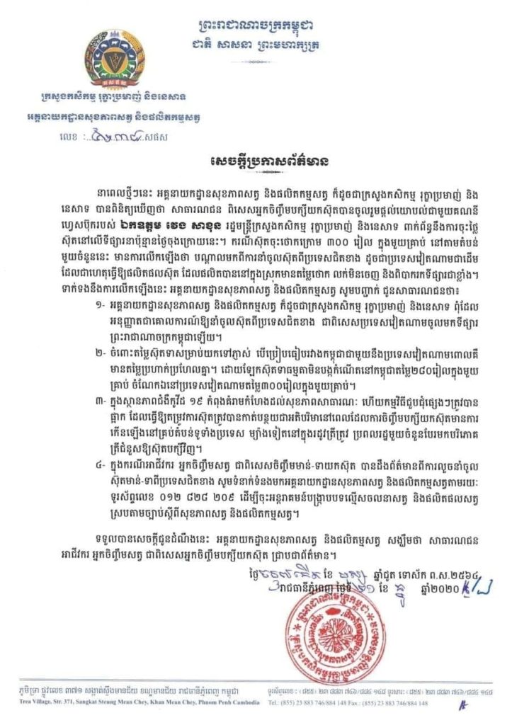 កាលពីថ្ងៃទី២១ ខែធ្នូ ឆ្នាំ២០២០ អគ្គនាយកដ្ឋានសុខភាពសត្វ និងផលិតកម្មសត្វ នៃក្រសួងកសិកម្ម រុក្ខាប្រមាញ់ និងនេសាទ បានចេញសេចក្តីប្រកាសព័ត៌មាន ដោយច្រានចោលនូវការលើកឡើងថា ករណីស៊ុតចុះថោក ក្រោម ៣០០រៀល ក្នុងមួយគ្រាប់ នៅតាមតំបន់មួយចំនួន បណ្តាលមកពីការនាំចូលស៊ុតពីប្រទេសជិតខាង ដូចជា ប្រទេសវៀតណាម ជាដើម។