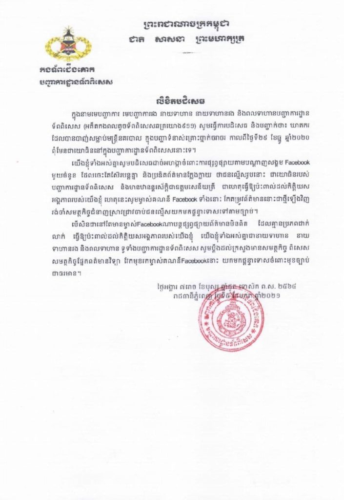 ការផ្សព្វផ្សាយដូច្នេះ ត្រូវបានបញ្ជាការដ្ឋានកងទ័ពពិសេស ចាត់ទុកថា ធ្វើឲ្យប៉ះពាល់ដល់កិត្តិយសអង្គភាពកងទ័ពពិសេស។ ហេតុនេះ បញ្ជាការដ្ឋានកងទ័ពពិសេស សូមឲ្យម្ចាស់ Facebook ទាំងនោះ កែតម្រូវព័ត៌មាននោះជាថ្មីឡើងិវញ ហើយរង់ចាំសមត្ថកិច្ចជំនាញ ស្រាវជ្រាវចាប់ជនល្មើសយកមកផ្តន្ទាទោសទៅតាមច្បាប់។