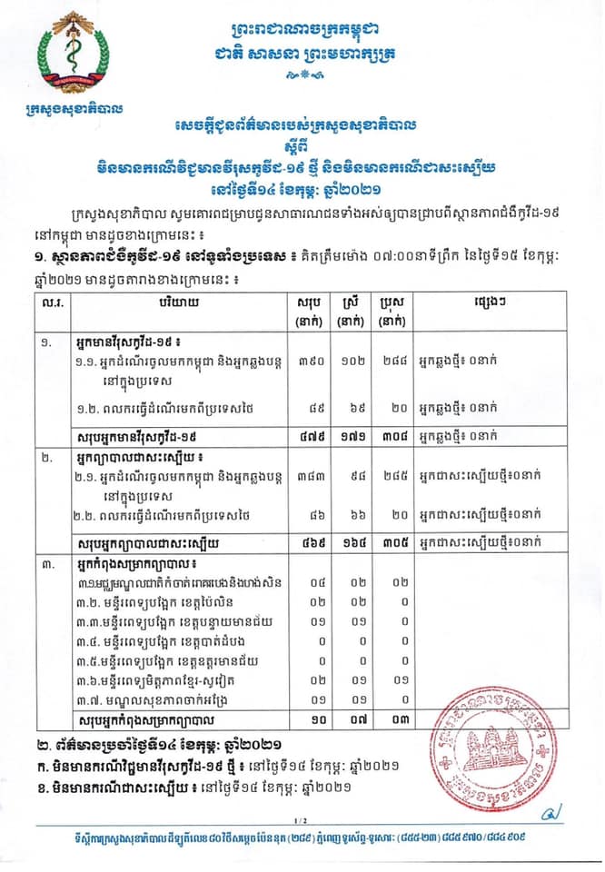 រាជធានីភ្នំពេញ ៖ នៅព្រឹកថ្ងៃទី១៥ ខែកុម្ភៈ ឆ្នាំ២០២១នេះក្រសួងសុខាភិបាលបានប្រកាសថា មិនករណីវិជ្ជមានថ្មី និងមិនករណីជាសះស្បើយផងដែរ ។