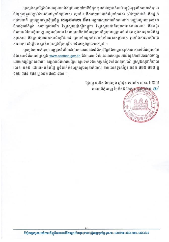 ក្រសួងបានបញ្ជាក់បន្តថា រយៈពេល៣ថ្ងៃជាប់គ្នាហើយ ដែលក្រសួងសុខាភិបាលរកមិនឃើញករណីឆ្លងជំងឺកូវីដ១៩ថ្មីមួយនេះ ។