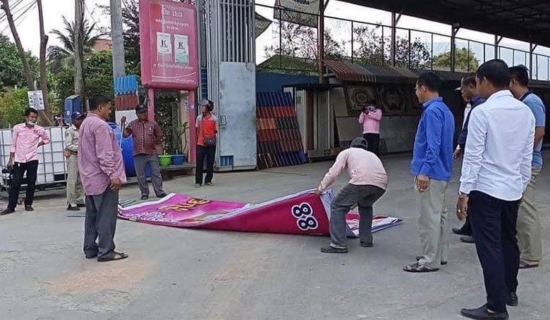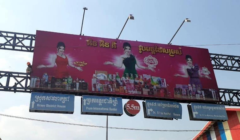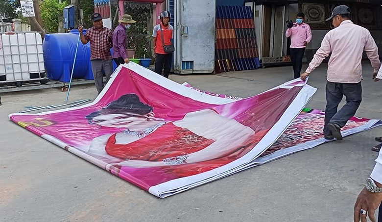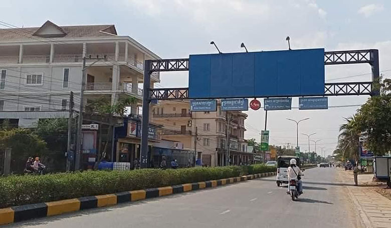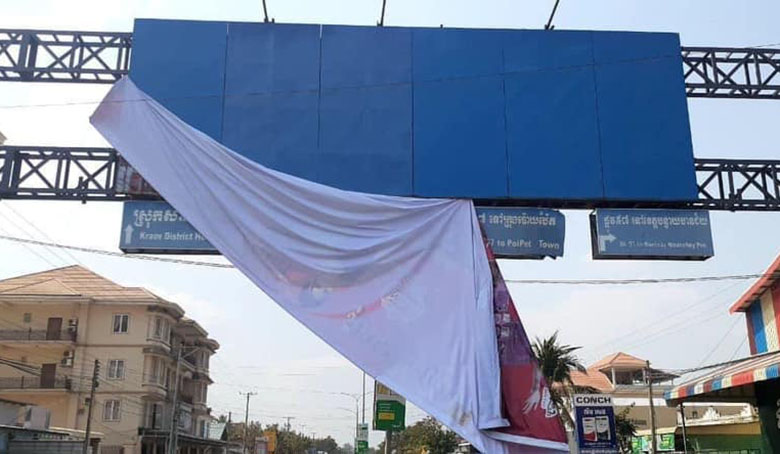 ផ្ទាំងប៉ាណូក្រុមហ៊ុន ទ្រី ដាណា កាត់ទទឹងផ្លូវនៅក្រុងប៉ៃលិន ដំឡើងរួច រុះរើចេញវិញ