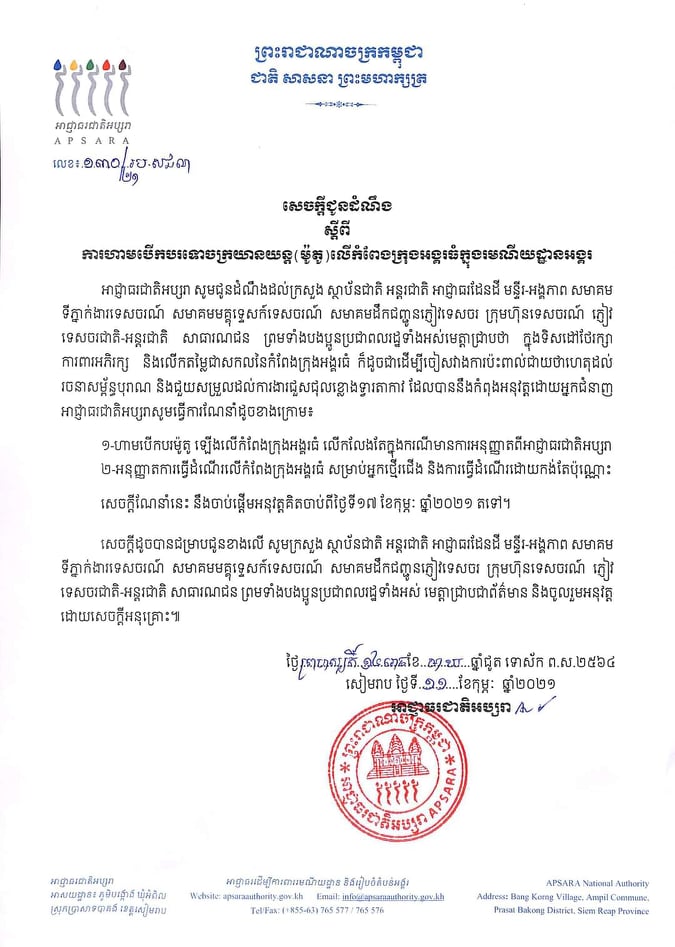 ចាប់ពីថ្ងៃស្អែកទោចក្រយានយន្តត្រូវហាមឃាត់មិនឱ្យជិះលើកំពែងក្រុងអង្គរធំក្នុងរមណីយដ្ឋានអង្គរ