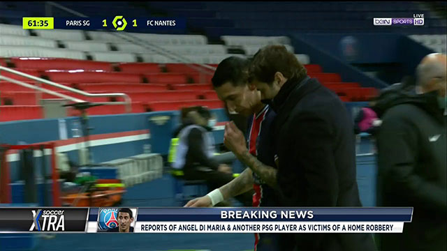 បារាំង ៖ កីឡាករ Angel Di Maria ត្រូវបង្ខំចិត្តប្តូរចេញអំឡុងការប្រកួតដែលក្រុម PSG ចាញ់ក្រុមភ្ញៀវ Nantes ក្នុងលទ្ធផល ២-១ កាលពីយប់មិញ ដើម្បីត្រឡប់ទៅផ្ទះភ្លាមៗ បន្ទាប់ពីចោរបានចូលលួចផ្ទះរបស់គេ ។
