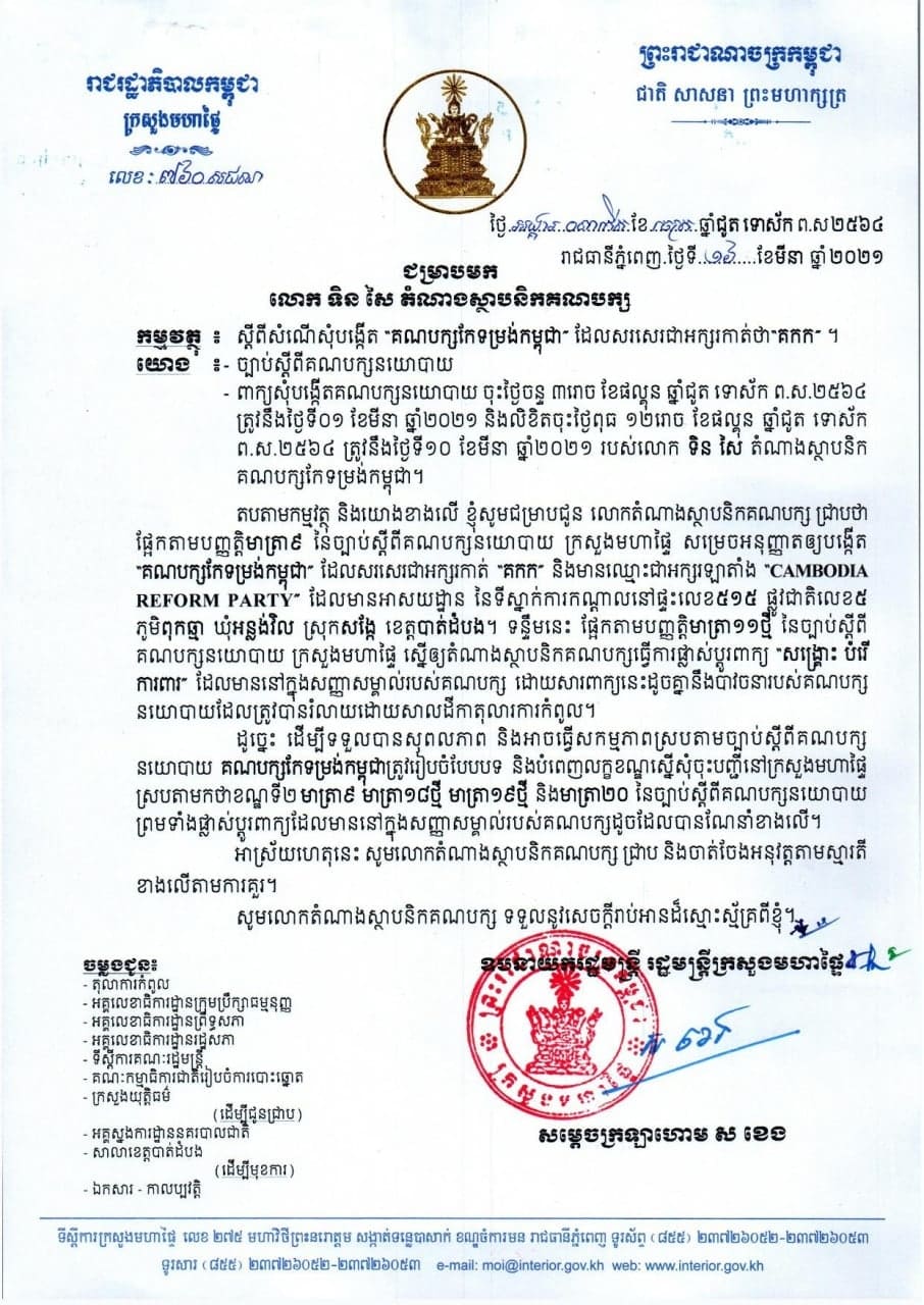 សម្ដេចក្រឡាហោម ស ខេង ឧបនាយករដ្ឋមន្ដ្រី រដ្ឋមន្ដ្រីក្រសួងមហាផ្ទៃ បានសម្រេចអនុញ្ញាតឲ្យបង្កើតគណបក្សកែទម្រង់កម្ពុជា ដែលសរសេរជាអក្សរកាត់ «គកក» និងមានឈ្មោះជាអក្សរឡាតាំង «CAMBODIA REFORM PARTY» មានអាសយដ្ឋាននៃទីស្នាក់ការកណ្តាល ផ្ទះលេខ៥១៥ ផ្លូវជាតិលេខ៥ ភូមិពុកឆ្មា ឃុំអន្លង់វិល ស្រុកសង្កែ ខេត្តបាត់ដំបង ។