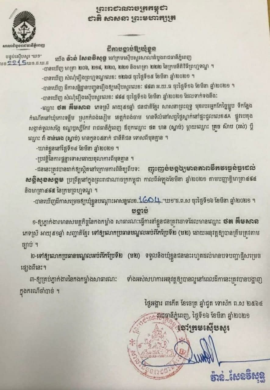 រាជធានីភ្នំពេញ ៖ អ្នកនាំពាក្យសាលាដំបូងរាជធានីភ្នំពេញ លោក គុជ គឹមឡុង កាលពីរសៀលថ្ងៃទី១៦ មីនា ឆ្នាំ២០២១ បានឲ្យដឹងថា…
