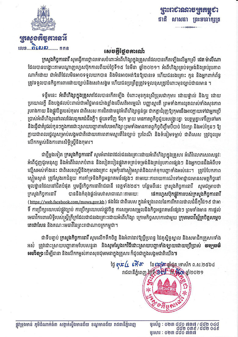 រាជធានីភ្នំពេញ ៖ នៅព្រឹកថ្ងៃទី១៧ ខែមីនា ឆ្នាំ២០២១ ក្រសួងកិច្ចការនារី បានចេញសេចក្តីថ្លែងការណ៍មួយ ថ្កោលទោសចំពោះអំពើហិង្សាក្នុងគ្រួសារដែលបានកើតឡើងលើអ្នកស្រី ដេត ម៉ាលីណា ដែលបានបង្ហោះតាមបណ្ដាញហ្វេសប៊ុកកាលពីយប់ថ្ងៃទី១៥ ខែមីនា ឆ្នាំ២០២១ ។ អំពើហិង្សាគ្រប់ទម្រង់ និងគ្រប់រូបភាពណាក៏ដោយ ជាអំពើដែលមិនអាចទទួលយកបាន និងមិនអាចអត់ឱនឱ្យបានទេ ហើយជនរងគ្រោះ កូន និងអ្នកពាក់ព័ន្ធ ត្រូវទទួលបានកិច្ចការពារដោយច្បាប់ និងសេវាសង្គម ហើយជនប្រព្រឹត្តត្រូវទទួលខុសត្រូវចំពោះមុខច្បាប់ជាធរមាន ។