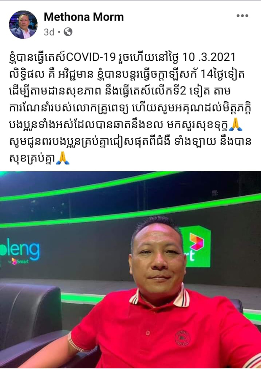 រាជធានីភ្នំពេញ ៖ លោកម៉ម មិថុនា ដែលជាអ្នកនិពន្ធដ៏មានស្នាដៃនៅក្នុងផលិតកម្មហង្សមាស ត្រូវបានប្រកាសថា លទ្ធផលធ្វើតេស្ត គឺមានវិជ្ជមានកូវីដ១៩ បន្ទាប់ពីលោកធ្វើតេស្តជាលើកទី២។ នេះជាបុគ្គលសំខាន់មួយទៀតដែលផ្ទុកវីរុសកូវីដ១៩…