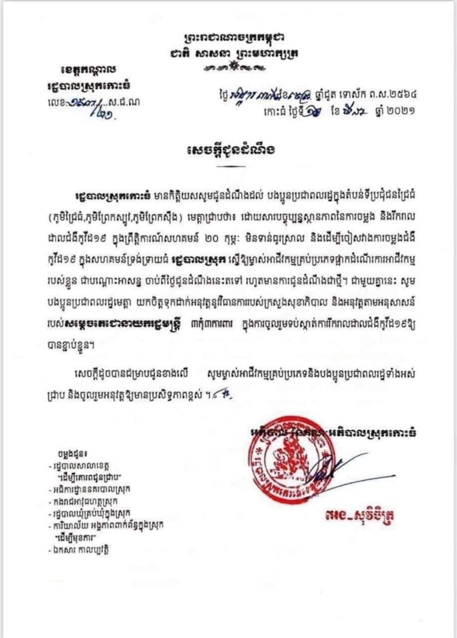 ជាមួយគ្នានោះដែរ រដ្ឋបាលស្រុកក៏សូមបងប្អូនប្រជាពលរដ្ឋមេត្តាយកចិត្តទុកដាក់អនុវត្តនូវវិធានការរបស់ក្រសួងសុខាភិបាល និងអនុវត្តតាមអនុសាសន៍របស់សម្តេចតេជោ នាយករដ្ឋមន្ត្រី ៣កុំ ៣ការពារក្នុងការចូលរួមទប់ស្កាត់ការរីករាលដាលជំងឺកូវីដ១៩ឱ្យបានខ្ជាប់ខ្ជួន ។