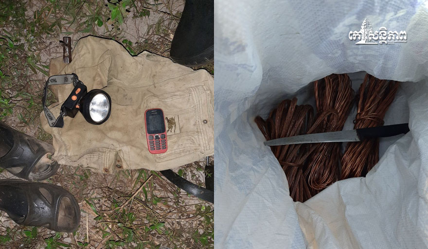 កង់១គ្រឿង , ខោចំនួន១ , ពិលចំនួន១គ្រឿង, ទូរស័ព្ទដៃអិនចុចពិលចំនួន១គ្រឿង, ស្បែកជើង១គូ , ការ៉ុងចំនួន១ ក្នុងការ៉ុងមានខ្សែភ្លើងចំនួន៣ដុំកំបិតតូច១ និងទុលឡាវីសកែច្នៃចំនួន១ និងបានពិនិត្យមើលនៅតាមបង្គោលភ្លើង ទើបដឹងថាជនសង្ស័យដែលរត់គេចបានធ្វើសកម្មភាពលួចកាត់ខ្សែភ្លើងខ្សែដី(ខ្សែណើត) អស់ចំនួន ៣បង្គោលយកខ្សែភ្លើងអស់៣សសៃ។ ដោយឡែក១បង្គោលទៀតកាត់ខ្សែហើយតែយកមិនទាន់បាន។