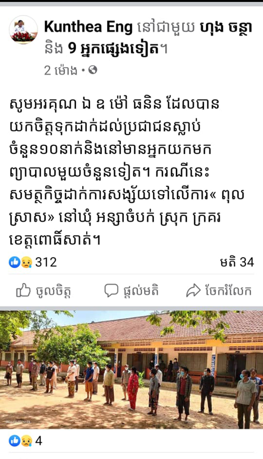 ដោយឡែកយោងតាមអាខោនហ្វេសប៊ុកដែលមានឈ្មោះ Kunthea Eng បានសរសេរក្នុងបណ្ដាញសង្គមថា (សូមអរគុណ ឯកឧត្តម ម៉ៅ ធនិន ដែលបានយកចិត្តទុកដាក់ដល់ប្រជាជនស្លា.ប់ចំនួន១០នាក់ និងនៅមានអ្ន យកមកព្យាបាលមួយចំនួនទៀត ។ ករណីនេះសមត្ថកិច្ចដាក់ការសង្ស័យទៅលើការពុលស្រា.ស ដែលបានកើតឡើងនៅឃុំអន្សាចំបក់ ស្រុកក្រគរខេត្តពោធិ៍សាត់ )។