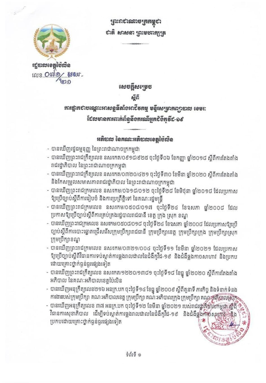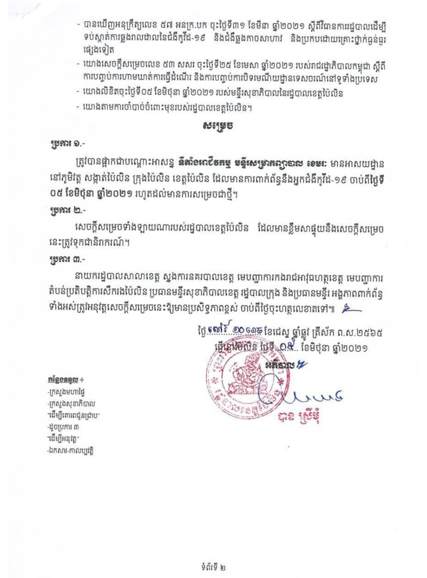 ប្រភពព័ត៌មានបានឱ្យដឹងថា ៖ ដោយយោងទៅលើសេចក្តីសម្រេចរបស់រដ្ឋបាលខេត្តប៉ៃលិន លេខ០៧១/២១ សសរ. ត្រូវបានសម្រេចផ្អាកជាបណ្តោះអាសន្នទីតាំងអាជីវកម្ម មន្ទីរសម្រាកព្យាបាល ខេមរ: ដែលមានជាប់ពាក់ព័ន្ធនឹងអ្នកជំងឺម្នាក់បានចូលទៅដេកសម្រាកព្យាបាលជំងឺ លុះក្រោយពីធ្វើតេ ស្តស្រាប់តែរកឃើញមានវិជ្ជមានជំងឺកូវីដ១៩ បង្កឱ្យមានការភ្ញាក់ផ្អើល ទើបអាជ្ញាធរខេត្តសម្រេចឱ្យបិទផ្អាកជាបណ្តោះអាសន្នតែម្តង ។ គួរបញ្ជាក់ថា សេចក្តីសម្រេចទាំងឡាយណារបស់រដ្ឋបាលខេត្តប៉ៃលិន ដែលមានខ្លឹមសារផ្ទុយនឹងសេចក្តីសម្រេចនេះ ត្រូវទុកជានិរាករណ៍ ។