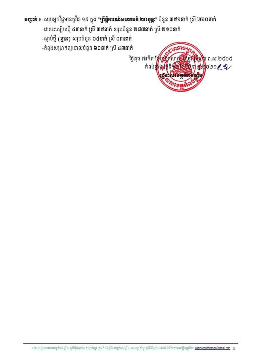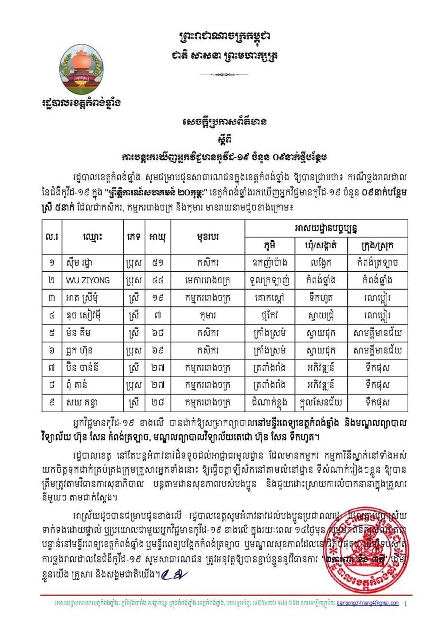 រដ្ឋបាលសាលាខេត្តកំពង់ឆ្នាំង នៅថ្ងៃទី១៦ ខែមិថុនា ឆ្នាំ២០២១ បានសេចក្តីប្រកាសព័ត៌មានស្តីពីការរកឃើញអ្នកវិជ្ជមានកូវីដ១៩ ចំនួន៩នាក់បន្ថែមទៀត