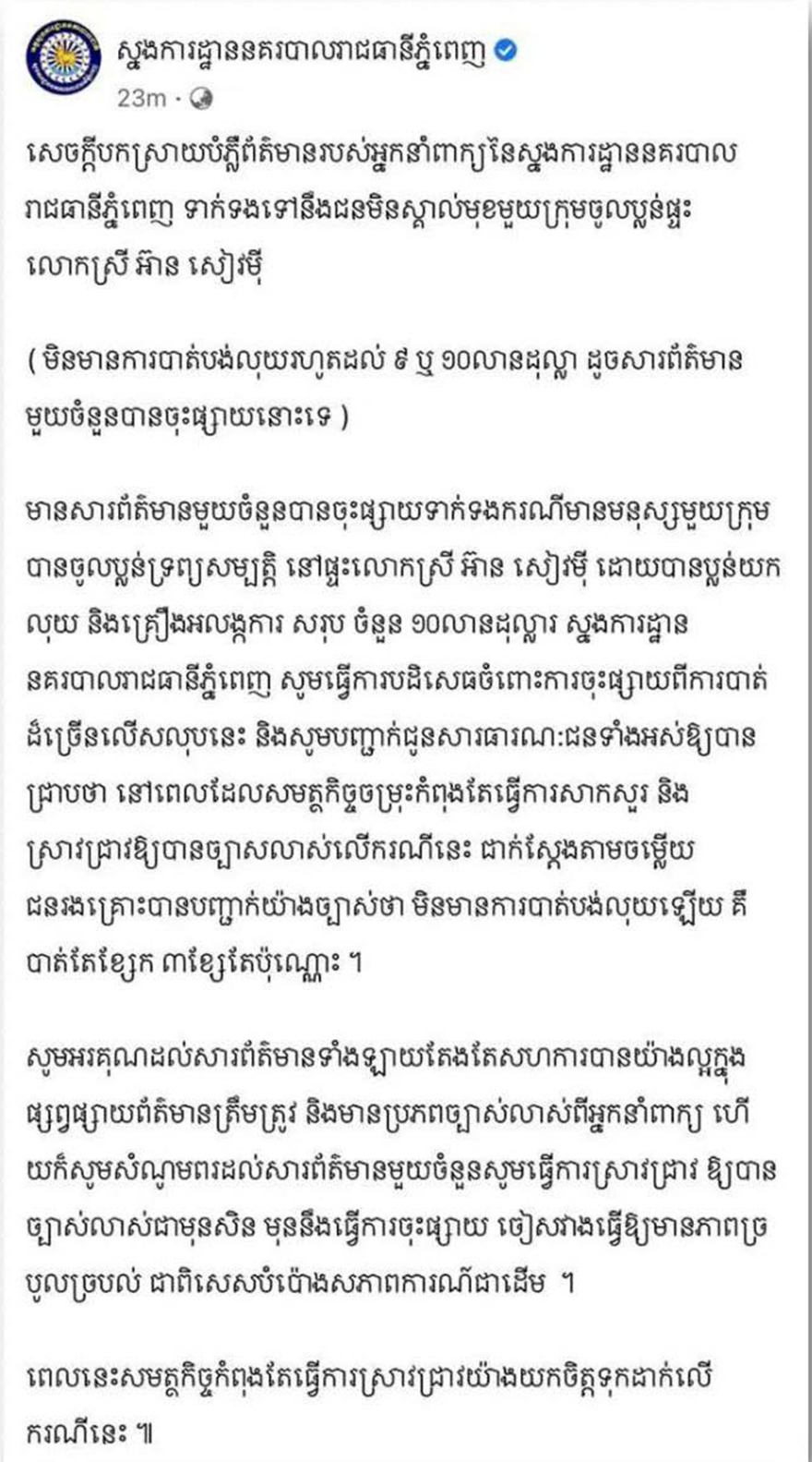 ក្រោយផ្ទុះការភ្ញាក់ផ្អើលរឿងចោរមិនស្គាល់មុខមួយក្រុម បានចូលប្លន់ផ្ទះលោកស្រី អ៊ាន សៀវម៉ី នៅលំនៅឋានមួយកន្លែងក្នុងរាជធានីភ្នំពេញ និងមានការផ្សព្វផ្សាយថា