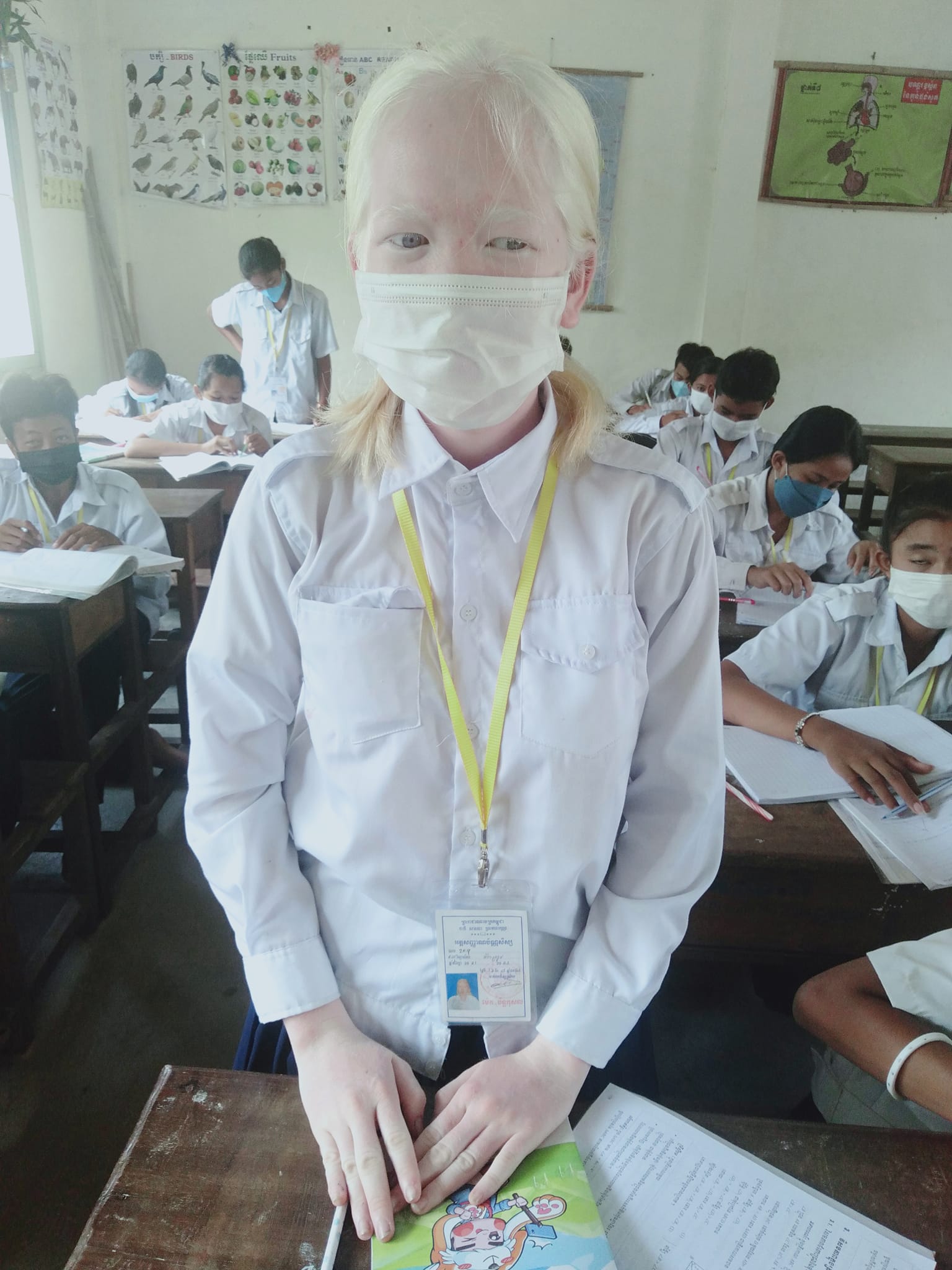 Meak Beya បន្តថា «ខ្ញុំកើតមក ២៣ឆ្នាំហើយ មានស្ថានភាពដូចគាត់ចឹង។ តែគាត់ដូចខ្ញុំចឹង មិនមែនងងឹតភ្នែកទេ គឺចាញ់ពន្លឺថ្ងៃ។ ពេលថ្ងៃ ត្រូវពាក់វ៉ែនតាខ្មៅ ហើយពាក់អាវដៃវែង។ ខ្ញុំដូចគាត់ចឹង។ ខ្ញុំរៀននៅមណ្ឌលដើម្បីភាពញញឹមនៃកុមារ ដែលគេហៅថា សាលាបារាំង PSE។ ខ្ញុំមានការពិនិត្យសុខភាពមួយឆ្នាំ ពីរដង។ ខ្ញុំបានរៀនចប់ រយៈពល ២ឆ្នាំ។ សម្រាប់សុខភាពខ្ញុំ ដូចគេធម្មតាទូទៅ។ តែបញ្ហាភ្នែក គឺចាញ់ពន្លឺថ្ងៃ ស្រទាប់ស្បែក មិនមានជាតិមេឡានីន សម្រាប់ការពារកំដៅថ្ងៃ»។