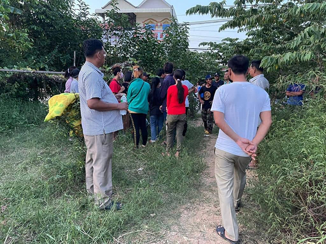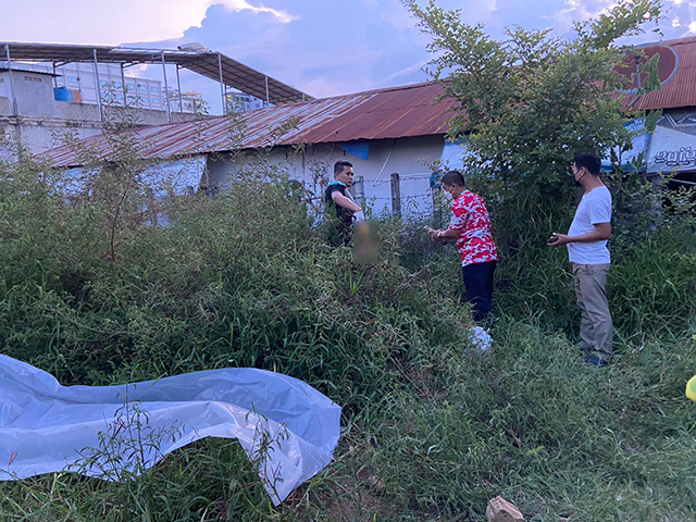 តាមការចុះពិនិត្យនៅកន្លែងកើតហេតុ បានរកឃើញ ស.ពស្ត្រីរងគ្រោះបានដេកស្លា.ប់នៅក្នុងព្រៃល្បោះនៃដីឡូតិ៍ទំនេរមួយកន្លែងក្នុងភូមិកើតហេតុខាងលើ ដោយនៅជិតស្ត្រីរងគ្រោះមានដបសាំង១ចំណុះ១លីត្រ និងដែកកេះពណ៏លឿង១ផងដែរ។