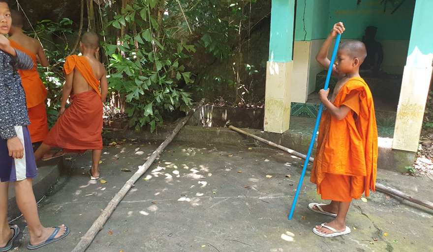 ព្រះអង្គមានសង្ឃដីកាបន្តទៀតថា ដោយឃើញហេតុការណ៍ដ៏កម្រនេះ ព្រះសង្ឃក៏បានយកដើមឬស្សី បុកសត្វពស់ថ្លាន់ដែលកំពុងរួមរឹតសុនខមេ (ឆ្កែ)នោះ ។ ហើយមិនយូរប៉ុន្មាន ពស់ថ្លាន់មួយក្បាលនោះ ក៏បានលាពីការរួមរឹតសុនខមេ (ឆ្កែ) ហើយពស់ថ្លាន់នោះលូនចូលក្នុងរូងភ្នំវិញបាត់ទៅ។