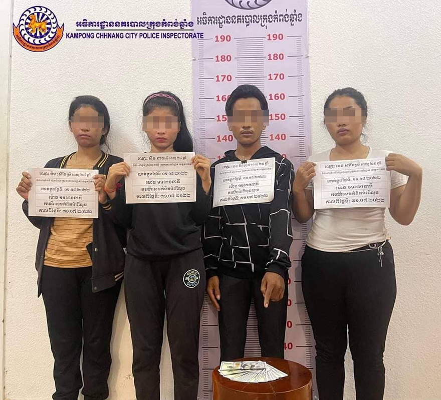 ខេត្តកំពង់ឆ្នាំង ៖ សមត្ថកិច្ចនគរបាលការិយាល័យព្រហ្មទណ្ឌកំរិតស្រាល នៃស្នងការដ្ឋាននគរបាលខេត្តកំពង់ឆ្នាំង នៅរសៀលថ្ងៃទី២ ខែសីហា ឆ្នាំ២០២២នេះ បានបញ្ជូនខ្លួនជនសង្ស័យប្រុសស្រីចំនួន៤នាក់ទៅកាន់តុលាការ ពីបទ«លួចលុយដុល្លារពិតរបស់ភ្ញៀវ ដែលចូលទៅម៉ាស្សា រួចបន្លំដាក់លុយដុល្លារក្លែងក្លាយចូលក្នុងកាបូបភ្ញៀវវិញ» ។ ករណីនេះ ប្រព្រឹត្តឡើងកាលពីយប់ថ្ងៃទី៣១ ខែកក្កដា ឆ្នាំ២០២២ នៅចំណុចហាងម៉ាស្សាមួយកន្លែង យីហោ «777» ស្ថិតនៅក្នុងភូមិទី៣ សង្កាត់ខ្សាម ក្រុងកំពង់ឆ្នាំង។