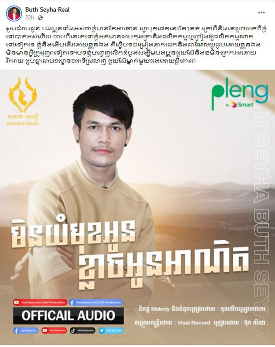 ជាក់ស្ដែង បើយោងតាមគណនីហ្វេសប៊ុកផេកផ្លូវការរបស់លោក ដែលមានឈ្មោះថា Buth Seyha Real បានបង្ហាញសារដ៏រំភើបទៅកាន់អ្នកគាំទ្រថា «សូមជំរាបជូន បងប្អូនទាំងអស់ថាខ្ញុំមានតែអាខោនហ្វេសប៊ុកផេកនេះតែមួយគត់ ក្រៅពីនឹងគេលួចយកពីខ្ញុំទៅបាត់អស់ហើយ ចាប់ពីនេះតទៅខ្ញុំអត់មានជាប់កុងត្រានឹងផលិតកម្ម ឬច្រៀងឲ្យផលិតកម្មណាតទៅទៀតទេ ខ្ញុំនិងងើបដើរដោយខ្លួនឯង គឺធ្វើបទចម្រៀងដាក់ផេក និងឆាណែលយូធូបដោយខ្លួនឯង មិនមានអ្វីត្រូវរុញរាទៀតទេ»។