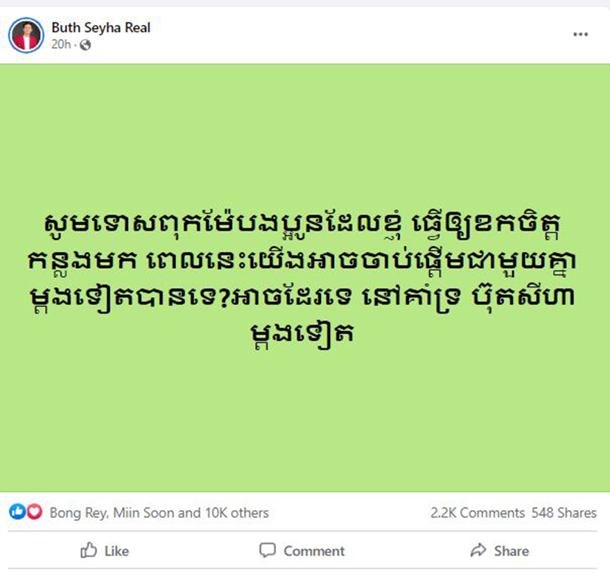 លោកបន្តថា «បទខ្ញុំបញ្ចេញលើកដំបូងសង្ឃឹមបងប្អូនជួយស៊ែរ និងខមិនត្រេកអរ ដោយរីករាយ ជួបគ្នាឆាប់ៗហ្វេនៗជាទីស្រលាញ់ ជួយស៊ែរម្នាក់មួយផងដោយក្តីគោរព»។ តារាប្រុសរូបនេះបន្តថា «សូមទោសពុកម៉ែបងប្អូន ដែលខ្ញុំធ្វើឲ្យខកចិត្តកន្លងមក ពេលនេះយើងអាចចាប់ផ្តើមជាមួយគ្នាម្តងទៀតបានទេ? អាចដែរទេ? នៅគាំទ្រ ប៊ុត សីហា ម្តងទៀត»។