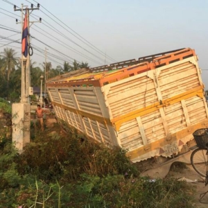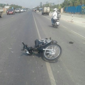 ខេត្តកណ្តាល ៖ រថយន្តដឹកទំនិញមួយគ្រឿងបានបើកវ៉ាជែងគ្នាជ្រុលចង្កូតទៅបុកម៉ូតូមួយគ្រឿងដែលកំពុងបើកបរបញ្ជ្រាស់ទិសគ្នាទាំងកំរោល បណ្តាលឲ្យស្ត្រីម្នាក់រងរបួសយ៉ាងធ្ងន់ធ្ងរកាលពីវេលាម៉ោង៦និង៤០នាទីព្រឹកថ្ងៃទី៤ ខែមីនា ឆ្នាំ២០១៧ នៅលើកំណាត់ផ្លូវជាតិលេខ១ត្រង់ចំណុចចន្លោះគីឡូម៉ែត្រលេខ៣៤និង៣៥ ក្នុងភូមិជ័យឧត្តម ឃុំសំរោងធំ ស្រុកកៀនស្វាយ ។