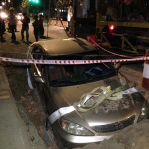 រាជធានីភ្នំពេញ ៖ បុរសម្នាក់បន្ទាប់ពីផឹកស៊ីស្រវឹងជោកជាំរួចមកបានបើករថយន្តកាមរីបាឡែនរបស់ខ្លួនបណ្តើររវល់តែលើកទូរស័ព្ទនិយាយ បណ្តាលឱ្យរេចង្កូតធ្លាក់រណ្តៅការរដ្ឋានជីកដាក់លូរបស់សាលារាជធានីតែមិនបណ្តាលឱ្យរងរបួសមនុស្សនោះទេ កាលពីវេលា ម៉ោង១១យប់ ថ្ងៃទី៨ មីនា តាមបណ្តោយផ្លូវ២៨៩ មុខវិទ្យាស្ថានជាតិសុខភាពសាធារណៈ ស្ថិតក្នុងសង្កាត់បឹងកក់២ ខណ្ឌទួលគោក ។
