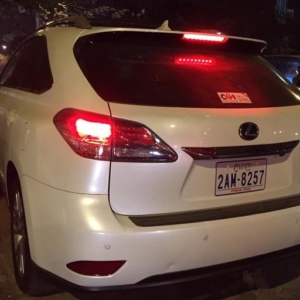 រាជធានីភ្នំពេញ ៖ រថយន្តកូរ៉ូឡាបាក់កញ្ចក់ ឆ្កូតថ្នាំ ទទួលសំណងពីម្ចាស់ម៉ូតូគ្រុបដែលជិះវ៉ារថយន្ត Lexus RX-450 ខាងឆ្វេង ដៃជ្រុលទៅបុកកៀរកៀបជាប់នៅកណ្តាលរថយន្តទាំង២គ្រឿង ប៉ុន្តែមិនបណ្តាលឱ្យគ្រោះថ្នាក់ដល់មនុស្សឡើយ ។