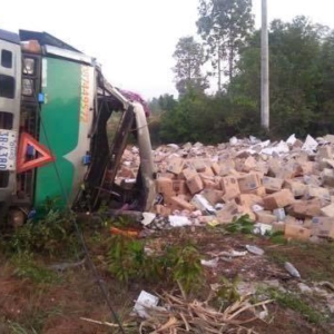 គួររំឮកថា កាលពីវេលាម៉ោង០៥ និង៣០នាទីទៀបភ្លឺថ្ងៃទី១៣ មីនា ២០១៧ រថយន្តសណ្តោងរ៉ឺម៉កកង់ដប់មួយគ្រឿង បានក្រឡាប់ផ្ងារជើងធ្លាក់ចេញពីផ្លូវប្រមាណ២០ម៉ែត្រ និងធ្លាក់ទំនិញចេញពីក្នុងរថយន្តចោលវាលស្រែទាំងអស់ ។ ហេតុការណ៍នេះ កើតឡើងលើកំណាត់ផ្លូវជាតិលេខ48 ត្រង់នៅចំណុចអូរម្កាក់ ក្នុងភូមិជីមាល ឃុំអណ្តូងទឹក ស្រុកបទុមសារគរ ។ បើតាមប៉ូលិសថា ករណីនេះកើតឡើងដោយសារអ្នកបើកបរងងុយដេក ។ លោកអធិការបញ្ជាក់ទៀតថា រថយន្តខាងលើជាប្រភេទរថយន្តដឹកទំនិញ ហើយដឹកទំនិញពីច្រកទ្វារអន្តរជាតិចាំយាម ឆ្ពោះទៅរាជធានីភ្នំពេញ ។ លុះមកដល់កន្លែងកើតហេតុ ក៏រេចង្កូតធ្លាក់កាវថ្នល់ក្រឡាប់ផ្ងារជើងតែម្តង ហើយពេលក្រឡាប់ក្អួតចេញទំនិញជាច្រើនមុខដូចជា ស្ករគ្រាប់ ភេសជ្ជៈគោជល់ និង ជាពិសេសឡេលាភស្បែក ដែលជាទំនិញដែលមានអត្រាពន្ធខ្ពស់។ លោកអធិការបន្ថែមទៀតថា ហេតុការណ៍នេះ បណ្តាលឱ្យអ្នកបើកបរ និងព្រូឡានរងរបួសស្រាល ។ ចំណែកទំនិញត្រូវបានរងការខូចខាតជាងពាក់កណ្តាល ដែលមុខទំនិញទាំងនោះ មានទំងន់សរុបប្រមាណជាង30តោន ៕