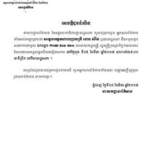 រាជធានីភ្នំពេញ ៖ នៅវិមានរដ្ឋសភា វេលាម៉ោង៩ព្រឹកថ្ងៃទី១៥ មីនា សម្តេចអគ្គមហាពញាចក្រី ហេង សំរិន ប្រធានរដ្ឋសភាជាតិ អនុញ្ញាតឲ្យលោក ផាម ប៊ិញមិញ (Pham Binh Minh) ឧបនាយករដ្ឋមន្ត្រី