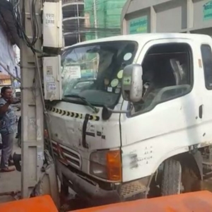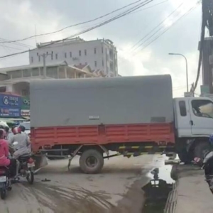 រថយន្តដឹកភេសជ្ជៈបុកបង្គោលភ្លើងបាក់ទាំងព្រឹកនៅស្តុបផ្សារដីហុយ
