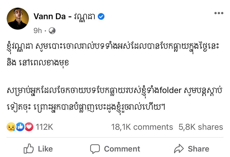 រាជធានីភ្នំពេញ ៖ នាយប់ថ្ងៃទី១៤ ចូលថ្ងៃទី១៥ ខែវិច្ឆិកា ឆ្នាំ២០២២ វេលាម៉ោង៣:០០ទៀបភ្លឺ មហាជនអ្នកគាំទ្រតារារ៉េបជួរមុខក្នុងប្រទេសកម្ពុជា លោក វណ្ណដា ប្រាកដជាបានទទួលជ្រាបច្បាស់រួចមកហើយ ដោយលោកបានបង្ហាញសារមួយឃ្លាប្រកាសច្បាស់ៗនៅលើបណ្ដាញសង្គមថា នឹងបោះបង់ចោលទាំងអស់រាល់បទដែលបានបែកធ្លាយនាពេលនេះ និងនៅពេលខាងមុខ ទាំងអារម្មណ៍ឈឺចុកចាប់ អួលណែនឧរាជាពន់ពេក ក្រោយមានអ្នកក្នុងក្រុមផលិតចម្រៀង ដែលជាដង្កូវក្នុងសាច់បានធ្វើឱ្យបែកធ្លាយ Folder បទចម្រៀងដែលជាស្នាដៃថ្មីៗរបស់លោកត្រៀមនឹងបញ្ចេញសម្រាប់អ្នកគាំទ្រនោះ។