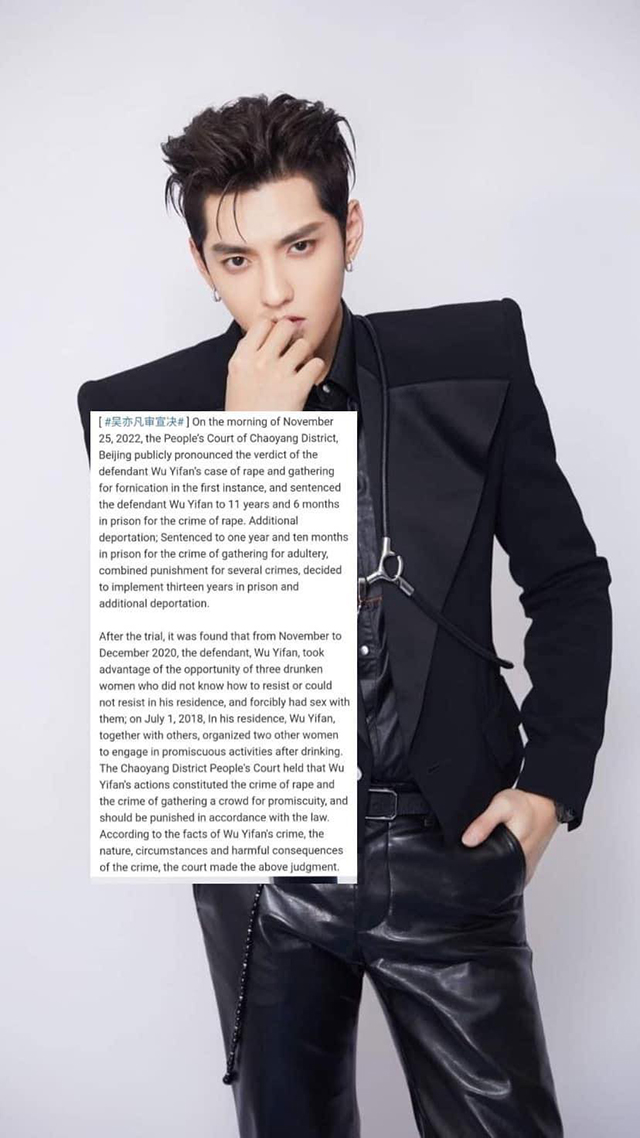 សារព័ត៌មានចិនបានចុះផ្សាយដោយដកស្រង់សម្តីថា «តុលាការប្រជាជននៃស្រុក Chaoyang ទីក្រុងប៉េកាំងបានប្រកាសជាសាធារណៈ នៅព្រឹកថ្ងៃទី 25 ខែវិច្ឆិកា ឆ្នាំ 2022 នេះ នូវសាលក្រមនៃសំណុំរឿងរបស់ចុងចោទ Wu Yifan ពីបទរំលោភបំពានផ្លូវភេ.ទ។ តារាប្រុសរូបនេះ ត្រូវបានកាត់ទោសឱ្យជាប់ពន្ធនាគាររយៈពេលមួយឆ្នាំដប់ខែពីបទឧក្រិដ្ឋជាច្រើន ហើយចុងក្រោយ ក៏ឈានដល់ការសម្រេចអនុវត្តការជាប់ពន្ធនាគាររយៈពេលចំនួន 13 ឆ្នាំរួមទាំងការនិរទេសចេញពីប្រទេសចិនទៀត។ គេបានរកឃើញថា ចុងចោទ Wu Yifan (ចាប់ពីខែវិច្ឆិកា ដល់ខែធ្នូ ឆ្នាំ 2020) បានឆ្លៀតឱកាស ពេលស្រវឹង បង្ខំស្ត្រីបីនាក់នៅក្នុងផ្ទះរបស់គាត់ ដោយបានរួមភេទជាមួយពួកគេយ៉ាងកំរោល។ នៅថ្ងៃទី 01 ខែកក្កដា ឆ្នាំ 2018 នៅក្នុងផ្ទះរបស់គាត់ Wu Yifan រួមជាមួយនឹងអ្នកផ្សេងទៀតបានឃុបឃិត ល្បួងស្ត្រីពីរនាក់ផ្សេងទៀតឱ្យធ្វើសកម្មភាពមិនសមរម្យ ក្រោយពីផឹកស្រា។