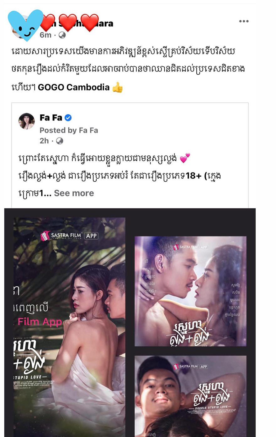 រាជធានីភ្នំពេញ ៖ ទស្សនិកជនដែលបានចូលទៅទស្សនាភាពរឿង «ស្នេហាល្ងង់+ល្ងង់» បានផ្ទុះការចាប់អារម្មណ៍យ៉ាងខ្លាំង បន្ទាប់ពីផ្ទៃរឿងមួយនេះ បានបង្កប់ឈុតឆាកស្នេហាបែបរោ.លរាល និងស៊ីអារម្មណ៍ ដែលត្រូវបានគេចាត់ទុកជារឿងដ៏សិចស៊ី (១៨+) មួយប្រចាំឆ្នាំ។ រឿង «ស្នេហាល្ងង់+ល្ងង់»នេះ ត្រូវបានផលិតឡើងដោយផលិតកម្មក្នុងស្រុកមួយ និងត្រូវបានដាក់បញ្ចាំងតែនៅលើ APP របស់ផលិតកម្មនេះប៉ុណ្ណោះ ខណៈពេលរឿងនេះចូលរួមសម្តែងដោយតារាស្រីនាង ហ្វា ហ្វា និងតួឯកប្រុសលោក ឡៅ បញ្ញា ជាអតីតម្ចាស់ជ័យលាភីចំណាត់ថ្នាក់លេខ២ ក្នុងកម្មវិធីប្រកួតបុរសឯក Mister Asian International 2019។
