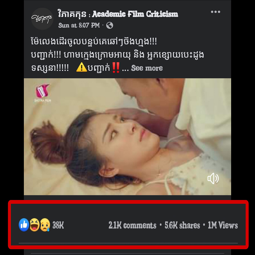 ជាក់ស្តែងគណនីហ្វេសប៊ុកបុរសមួយរូប បានលើកឡើងថា សិល្បៈភាពយន្ត គឺជាកញ្ចក់ឆ្លុះបញ្ចាំងពីសង្គម តែសិល្បៈនៅតែជាសិល្បៈ មិនមែនជាការពិតទេ។ លោកបញ្ជាក់ថា ខ្ញុំមិនគាំទ្រចំពោះការថតបែបអា.សអាភា.សទាំងស្រុងឡើយ តែខ្ញុំគាំទ្រការថតឈុតឆាករួមមេត្រីភាពបែបសិល្បៈពិតប្រាកដ ក្នុងក្របខណ្ឌត្រឹមត្រូវមួយ ជាមួយនឹងបំរាមហាមក្មេងក្រោមអាយុទស្សនា ប្រទេសណា ជំនាន់ណា ក៏មានការថតបែបនេះដែរ តែមានការគ្រប់គ្រងត្រឹមត្រូវក្នុងដែនកំណត់ច្បាស់លាស់មួយ។