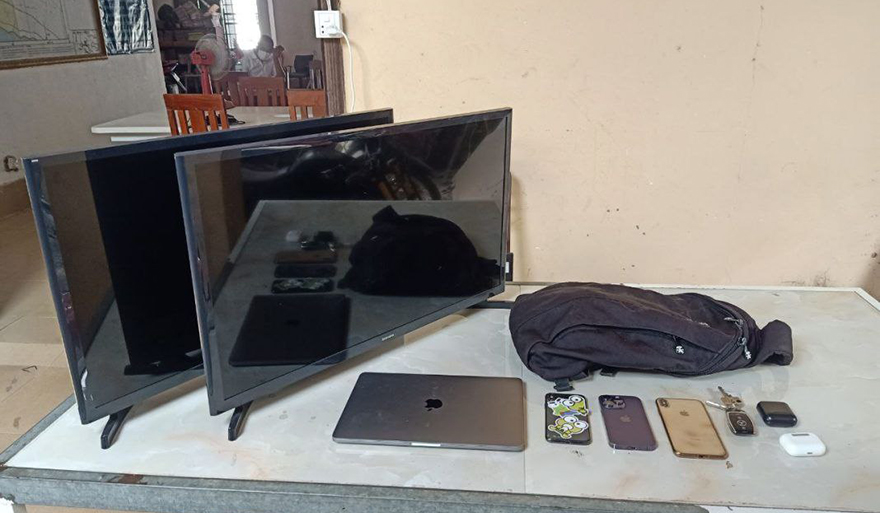 ចំណែកវត្ថុតាងដែលដកហូតបានមាន ៖ ម៉ូតូជនសង្ស័យចំនួន២គ្រឿង, ទូរស័ព្ទដៃចំនួន៣គ្រឿង, ទូរទស្សន៍ LED ចំនួន២គ្រឿង, កាបូបស្ពាយចំនួន១, កាសត្រចៀកចំនួន២ឈុត, កូនសោរថយន្តចំនួន១ និងកំព្យួទ័រចំនួន១គ្រឿងផងដែរ ដោយបានប្រគល់ជូនជនរងគ្រោះយកទៅប្រើប្រាស់វិញផងដែរ។