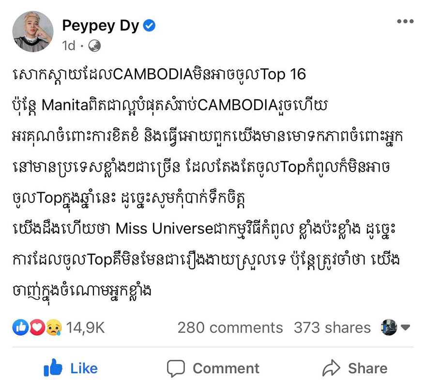 ទ្រាំមើលនឹងភ្នែកមិនបាន! Peypey Dy ពោលលើកទឹកចិត្ត ហង្ស ម៉ានីតា ក្រោយមិនអាចចូល Top ណាមួយបាន