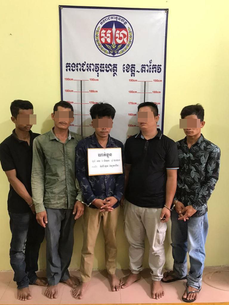 ចំពោះជនសង្ស័យទាំង ០៥ នាក់មាន ៖ ១.ឈ្មោះ អង សៅលី ភេទប្រុស អាយុ២៥ឆ្នាំ មុខរបរកម្មកររោងចក្រ រស់នៅភូមិអង្គរគគីរ ឃុំតាភេម ស្រុកត្រាំកក់ ខេត្តតាកែវ ។ ២.ឈ្មោះ ឡី ទី ភេទប្រុស អាយុ២៦ឆ្នាំ មុខរបរកម្មកររោងចក្រ រស់នៅភូមិបាក់កូដ ឃុំលាយបូរ ស្រុកត្រាំកក់ ខេត្តតាកែវ ។ ៣.ឈ្មោះ គង់ សំរិត ភេទប្រុស អាយុ៣២ឆ្នាំ មុខរបរកម្មកររោងចក្រ រស់នៅភូមិខា្លគ្រហឹម ឃុំតាភេម ស្រុកត្រាំកក់ ខេត្តតាកែវ ។ ៤.ឈ្មោះ តិ ជ័យ ភេទប្រុស អាយុ៣០ឆ្នាំ មុខរបរកម្មកររោងចក្រ រស់នៅភូមិម្រុំ ឃុំតាភេម ស្រុកត្រាំកក់ ខេត្តតាកែវ ។ ៥.ឈ្មោះ រិន ធឿន ភេទប្រុស អាយុ២៧ ឆ្នាំមុខរបរកម្មកររោង ចក្រ រស់នៅភូមិពងទឹក ឃុំគុស ស្រុកត្រាំកក ខេត្តតាកែវ ។