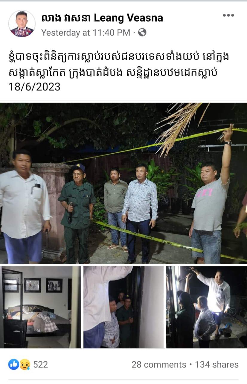 នៅក្នុងបណ្ដាញសង្គមផ្ទាល់ខ្លួន គេឃើញលោក លាង វាសនា អភិបាលក្រុងបាត់ដំបង បានបង្ហោះរូបភាពប៉ុន្មានសន្លឹក ដែលលោកបានពិព័ណ៌នាអំពីសកម្មភាពរបស់លោក ដឹកនាំមន្ត្រីក្រោមឪវ៉ាទចុះពិនិត្យសាកសពជនរបទេសនោះទាំងកណ្ដាលយប់។ នៅក្នុងរូបភាពប៉ុន្មានសន្លឹកនោះ គេឃើញមានអ្នកទាញលើកខ្សែបំរាមពណ៌លឿងហ៊ុមព័ទ្ធទីតាំងកើតហេតុ ឲ្យលោក លាង វាសនា នាំកម្លាំងចូលយ៉ាងកៀកទ្វារនៃបន្ទប់ ដើម្បីពិនិត្យនិងថតរូបសាកសព ដែលមានអ្នកបញ្ចាំងពិលបំភ្លឺទៀតផង។