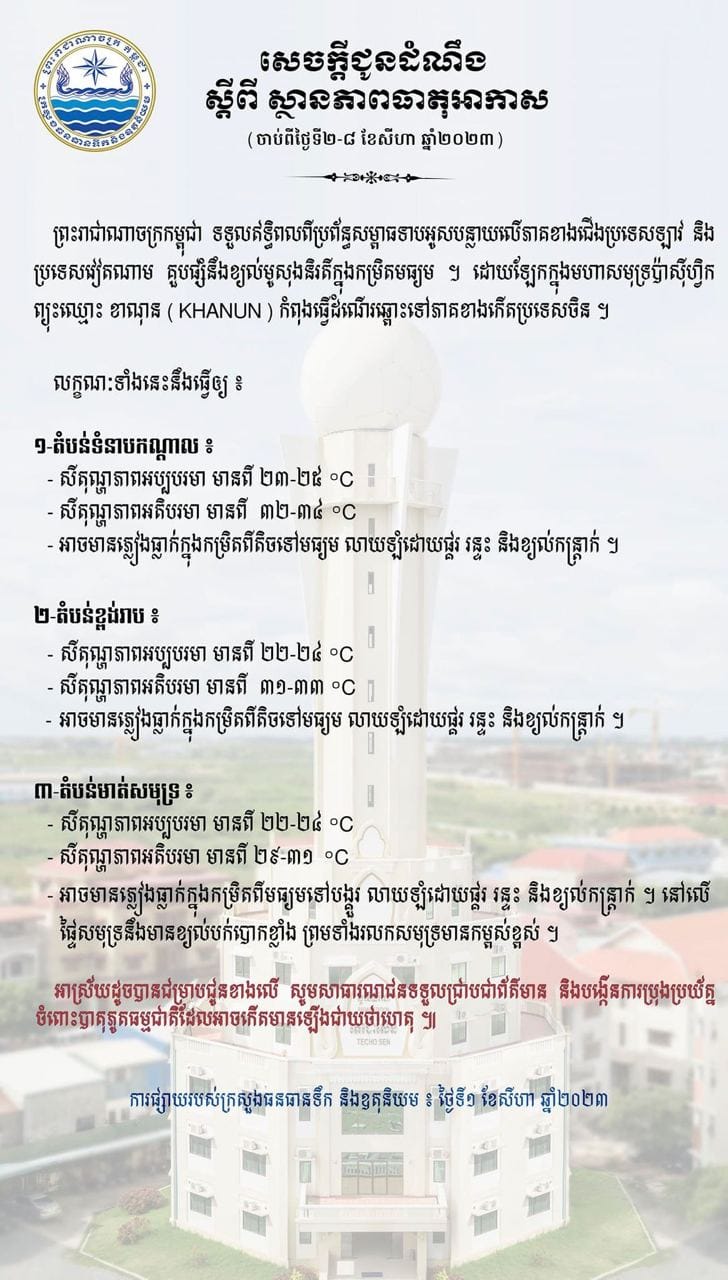 យោងតាមសេចក្តីជូនដំណឹងស្ដីពីស្ថានភាពធាតុអាកាសចាប់ពីថ្ងៃទី២-៨ ខែសីហា ឆ្នាំ២០២៣ របស់ព្រះរាជាណាចក្រកម្ពុជាទទួលឥទ្ធិពលពីប្រព័ន្ធសម្ពាធទាបអូសបន្លាយលើភាគខាងជើង ប្រទេសឡាវ និង ប្រទេសវៀតណាម គួបផ្សំនឹងខ្យល់មូសុងនិរតីក្នុងកម្រិតមធ្យម ។