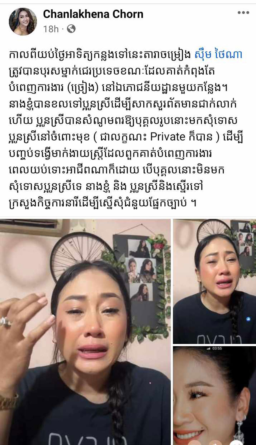 តាមរយៈបណ្តាញសង្គម អ្នកនាង ចន ច័ន្ទលក្ខិណា បានបង្ហោះសារថា «កាលពីយប់ថ្ងៃអាទិត្យ កន្លងទៅនេះ តារាចម្រៀង ស៊ឹម ថៃណា ត្រូវបានបុរសម្នាក់ជេ.រប្រទេច ខណៈពេលដែលគាត់កំពុងតែបំពេញការងារ (ច្រៀង) នៅឯភោជនីយដ្ឋានមួយកន្លែង»។ នាងបញ្ជាក់ថា «នាងខ្ញុំបានខលទៅប្អូនស្រី ដើម្បីសាកសួរព័ត៌មានជាក់លាក់ ហើយប្អូនស្រីបានសំណូមពរឱ្យបុគ្គលរូបនោះមកសុំទោសប្អូនស្រីនៅចំពោះមុខ (ជាលក្ខណៈ Private ក៏បាន ) ដើម្បីបញ្ចប់ទង្វើមាក់ងា.យស្ត្រីពេលដែលពួកគាត់បំពេញការងារពេលយប់ ទោះអាជីពណាក៏ដោយ បើបុគ្គលរូបនោះ មិនមកសុំទោសប្អូនស្រីទេ នាងខ្ញុំ និងប្អូនស្រី នឹងស្នើទៅក្រសួងកិច្ចការនារី ដើម្បីស្នើសុំជំនួយផ្នែកច្បាប់»។