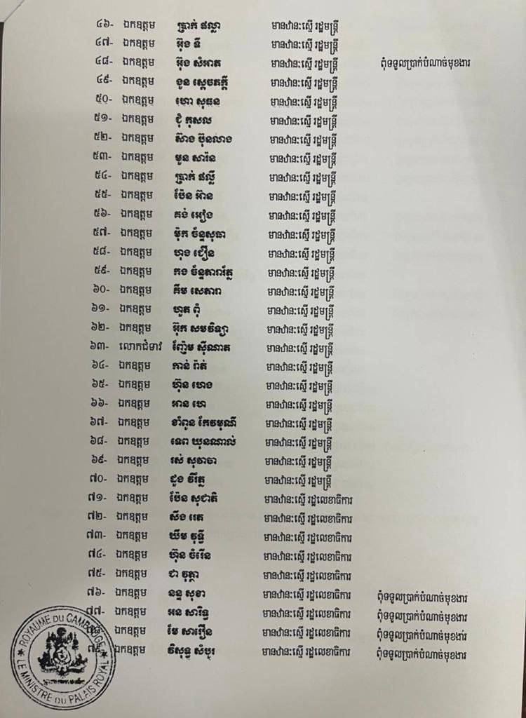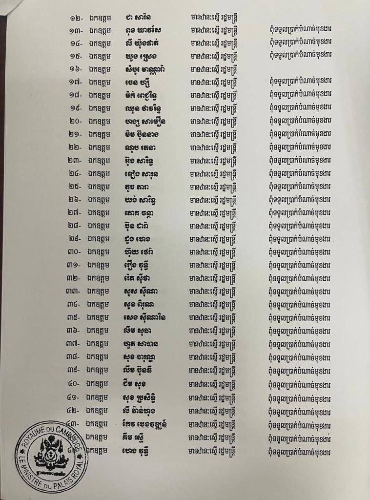 ភ្នំពេញ៖ ព្រះករុណា ព្រះមហាក្សត្រ បានសព្វព្រះហឫទ័យ ត្រាស់បង្គាប់ តែងតាំងបុគ្គលសំខាន់ៗ ចំនួន ១០៤រូប ជាទីប្រឹក្សាផ្ទាល់របស់លោកបណ្ឌិត ហ៊ុន ម៉ាណែត នាយករដ្ឋមន្ត្រីកម្ពុជា។ ក្នុងចំណោមទីប្រឹក្សាផ្ទាល់ទាំង ១០៤រូប មានឋានៈស្មើទេសរដ្ឋមន្ត្រី រដ្ឋមន្ត្រី រដ្ឋលេខាធិការ និងឋានៈស្មើអនុរដ្ឋលេខាធិការ។ ទីប្រឹក្សារបស់លោកនាយករដ្ឋមន្ត្រីបណ្ឌិត ហ៊ុន ម៉ាណែត ភាគច្រើន ពុំទទួលយកប្រាក់បំណាច់មុខងារទេ។