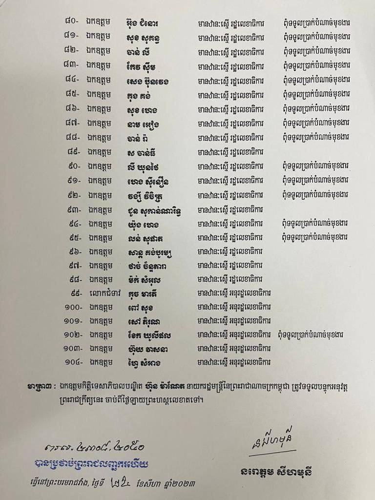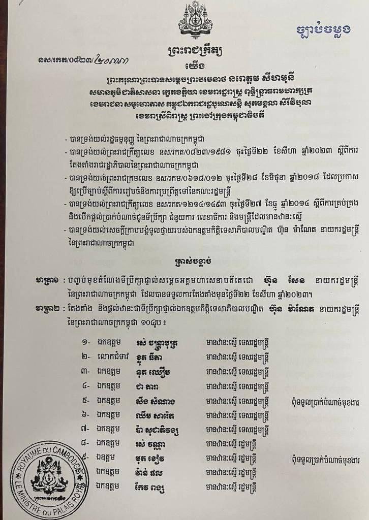 ព្រះមហាក្សត្រ ត្រាស់បង្គាប់តែងតាំង ទីប្រឹក្សាផ្ទាល់លោកបណ្ឌិត ហ៊ុន ម៉ាណែត នាយករដ្ឋមន្ត្រី ចំនួន ១០៤រូប