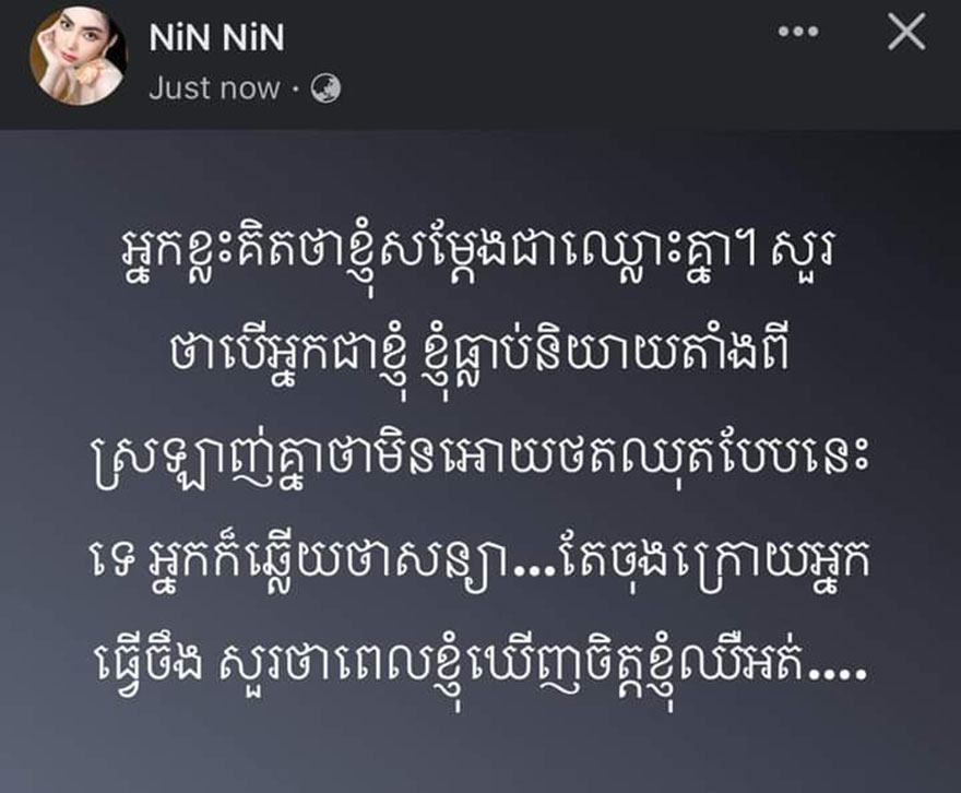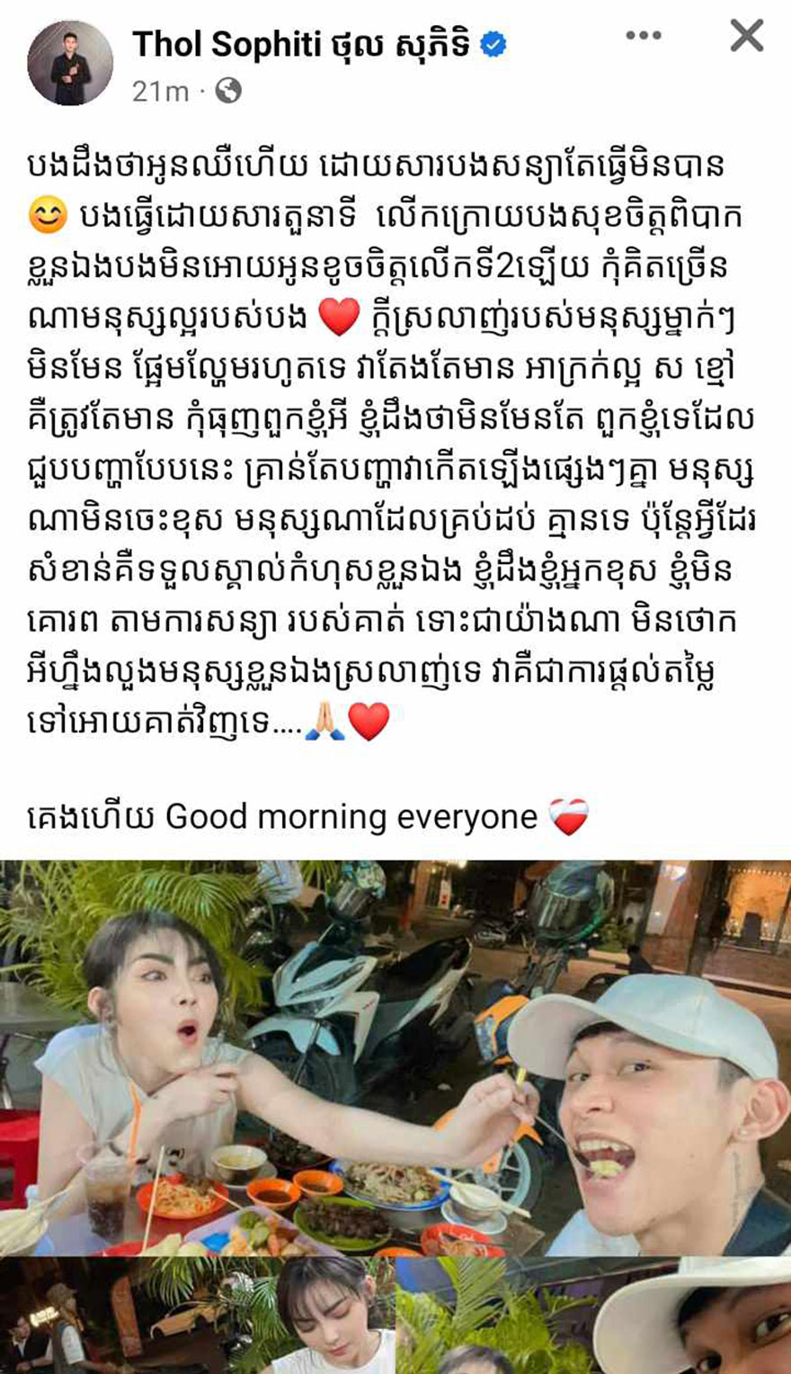 ទោះបីជាយ៉ាងណា ចុងក្រោយតារាចម្រៀងលោក ថុល សុភិទិ ក៏បានបញ្ចេញសារថា «បងដឹងថាអូនឈឺហើយ ដោយសារបងសន្យាតែធ្វើមិនបាន បងធ្វើដោយសារតួនាទី លើកក្រោយបងសុខចិត្តពិបាកខ្លួនឯង បងមិនអោយអូនខូចចិត្តលើកទី២ឡើយ កុំគិតច្រើនណាមនុស្សល្អរបស់បង»។